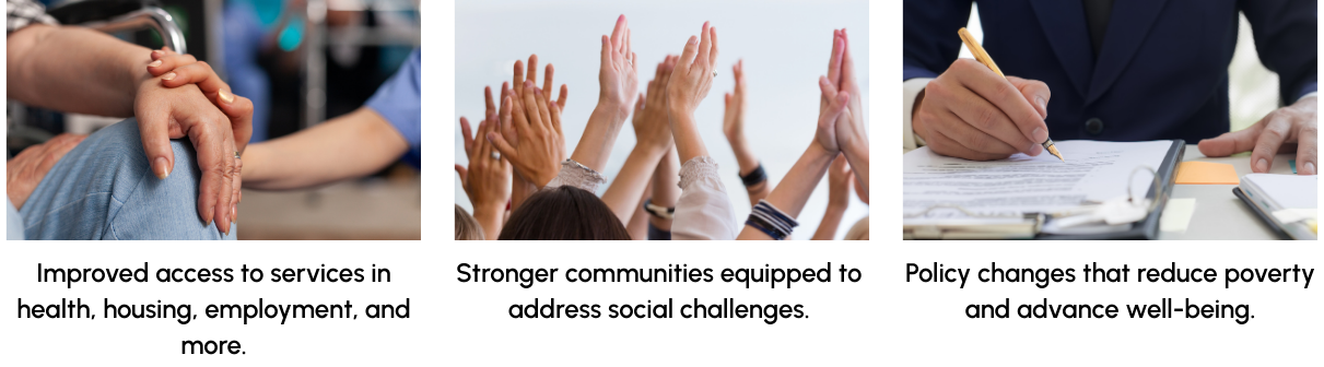 We focus on poverty reduction and the social determinants of health through: